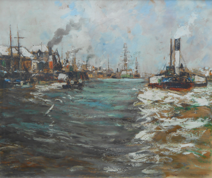He was a genuine artistic traveller yet he drew inspiration very near to home – the bustling shipping on the River Clyde, where flourishing shipyards at the time were hailed as the workshops of the Western world. “In his river paintings, he strived to capture the atmosphere of industrialisation, the smoke and grime, rather than romanticising about the sea. Smoke, steam, water, light and the great silhouetted forms of ships captured this reality in a dramatic way.” Anne C. O’Neill. Born on the Firth of Clyde, where his father was stationed as a Royal Naval Officer, observing the river and its shipping was familiar to him as he grew up.